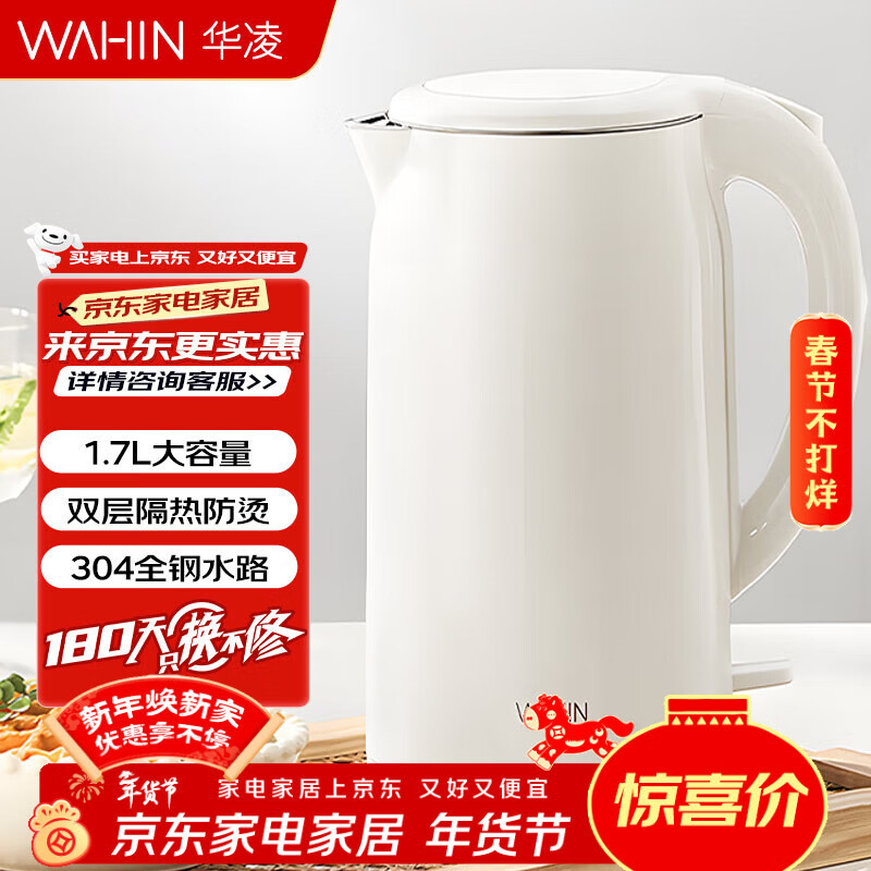 华凌美的出品 电水壶热水壶 304不锈钢1.7L暖水壶烧水壶开水壶双层隔热 无缝内胆WH-H1