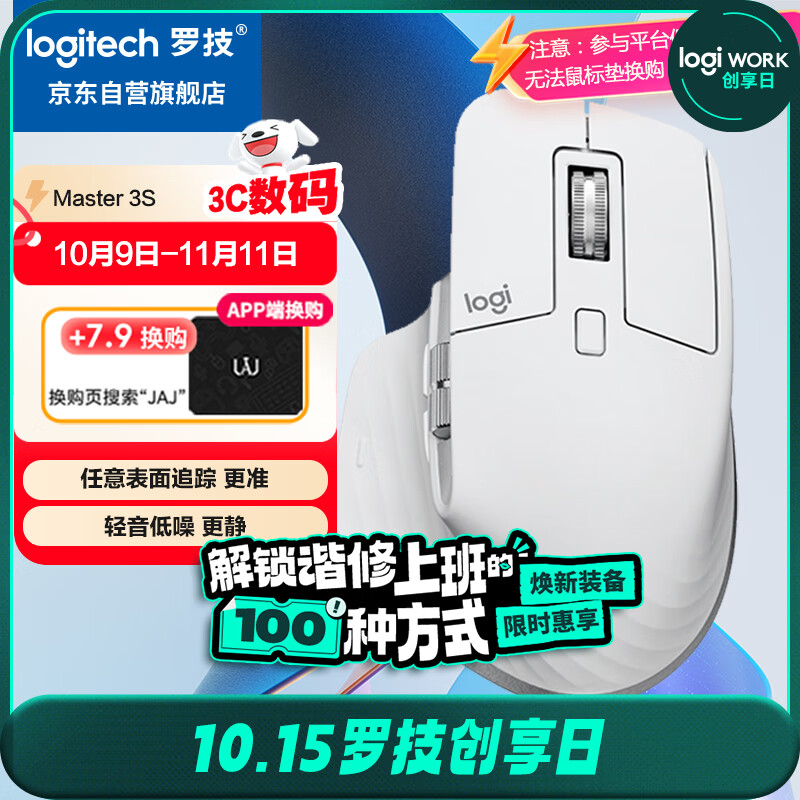 罗技(Logitech)大师系列 MX Master 3S 无线蓝牙鼠标 人体工学 办公 静音鼠标 高端 珍珠白 带无线接收器