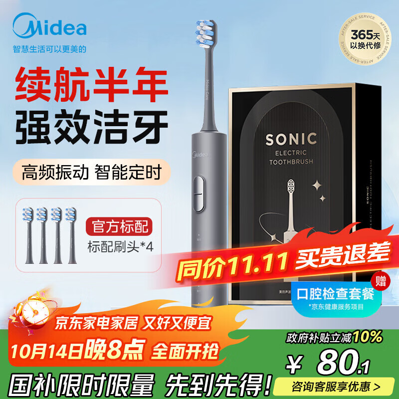美的(Midea)电动牙刷S1PX星空灰成人/学生 4支刷头 180天超长续航 磁悬浮声波马达 男士女士专用 生日节日礼物