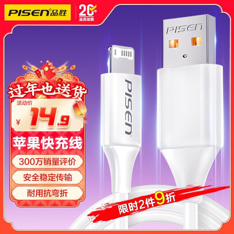 品胜[新升级]苹果数据线快充充电线 适用iPhone14promax/13/12/11/8/Xs手机平板iPad车载USB充电器线
