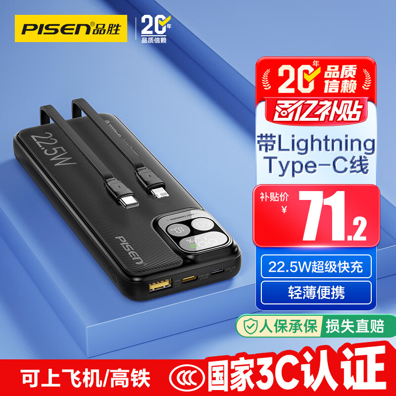 品胜【3C认证】充电宝自带线10000毫安大容量22.5W快充可上飞机移动电源适用苹果17promax小米华为黑