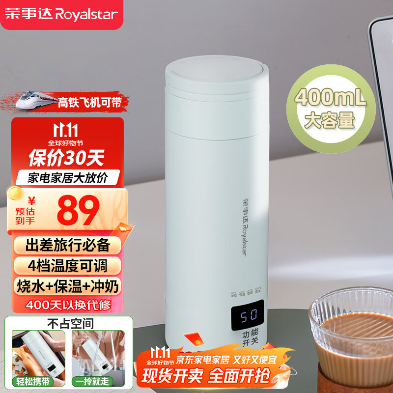 荣事达(Royalstar)电热水杯便携式旅行烧水壶加热水杯冲奶保温304不锈钢四档调温400ml直饮杯智能款RS-CP05B提手可拎