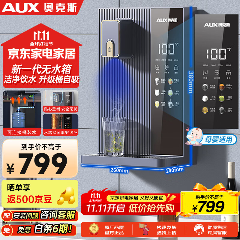 奥克斯(AUX)家用高端净水器净饮机伴侣 壁挂式饮水机 即热即饮 全通量适配 全水路杀菌速热管线机YGX-2201W