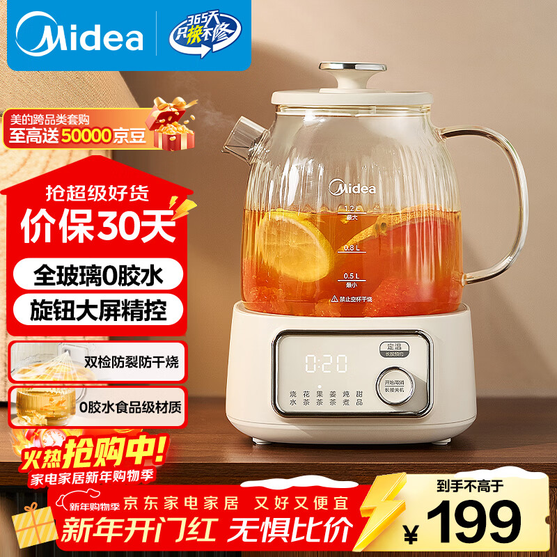 美的(Midea)花漾0胶水全玻璃养生壶 多功能煮茶壶 母婴烧水壶 恒温电热水壶 全自动一体煮茶器1.2L YS12B302J