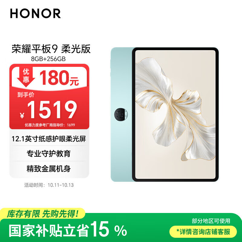 荣耀平板9柔光版 【国家补贴】12.1英寸平板电脑8+256GB 纸感护眼柔光屏 专业教育守护天青色