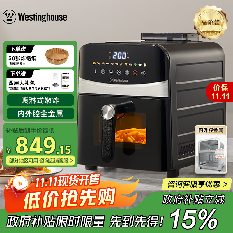西屋(Westinghouse)空气炸锅9升大容量可视化金属内腔体蒸汽上下管免翻面炸锅 WKZ90H20