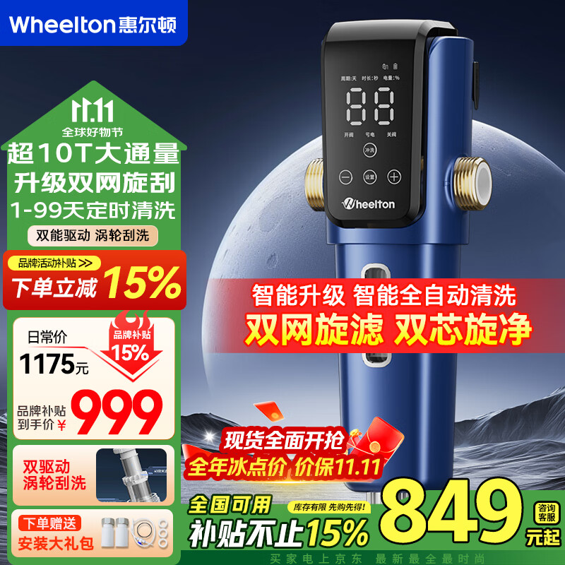 惠尔顿前置过滤器家用智能全自动清洗双网旋滤10T大流量全屋净水器水龙头反冲洗防爆过滤器P0063MAX