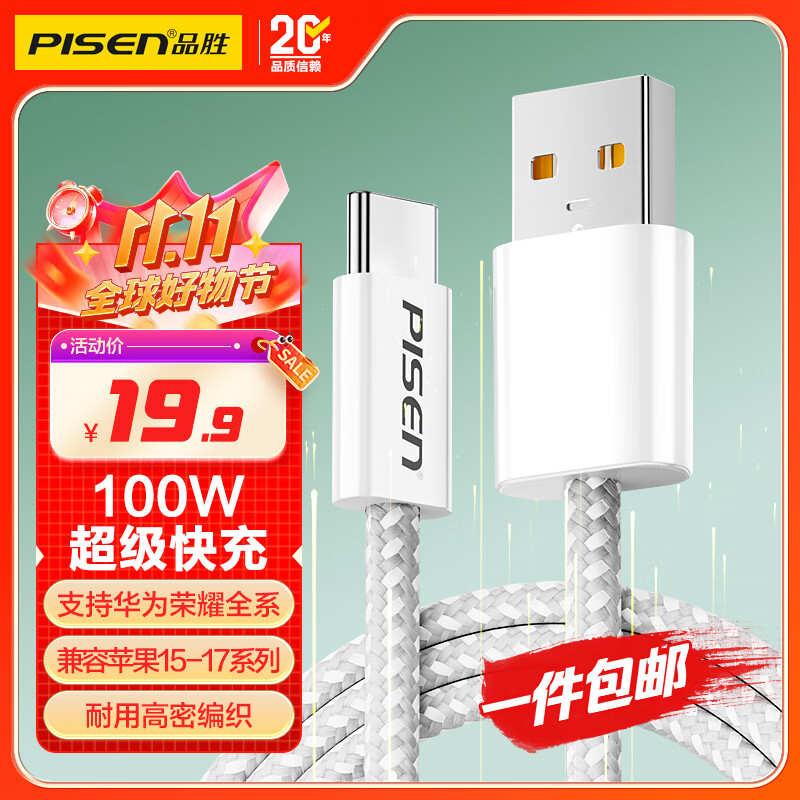 品胜苹果17/16充电线type-c数据线100W/66W快充6a车载适用华为mate70p80小米手机ip15平板AirPodsPro3