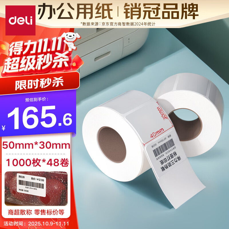 得力(deli)50*30mm 1000张*48卷 薄荷海三防热敏标签纸 快递面单不干胶打印纸 ZG162【适配3寸标签机720C等】