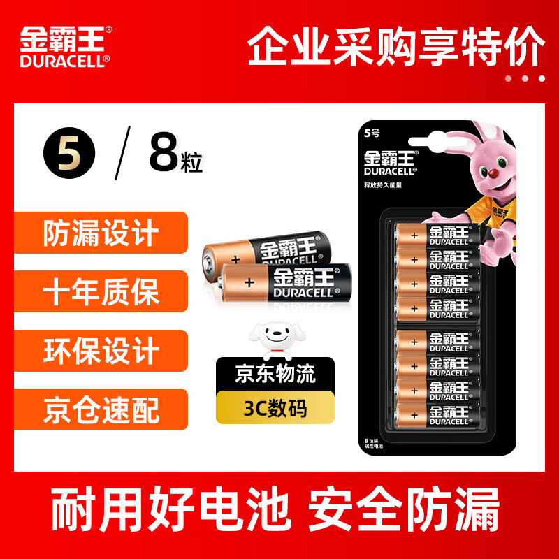 金霸王(Duracell)5号电池8粒装碱性干电池五号适用博朗耳温枪/血糖仪/鼠标键盘/指纹锁/血压计等
