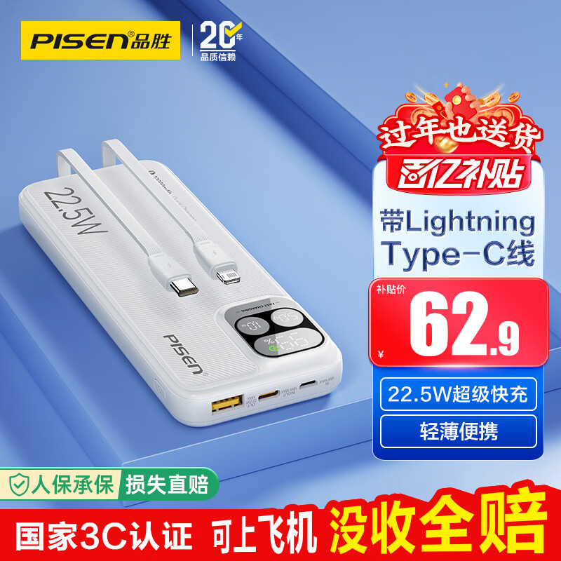 品胜【3C认证可上飞机】充电宝自带线10000毫安大容量22.5W快充移动电源适用苹果17promax小米华为 白
