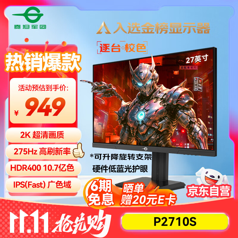 泰坦军团27英寸 2K 275Hz超高刷新率HDR400 FastIPS 10.7亿色 硬件低蓝光 旋转升降电竞显示器240Hz P2710S