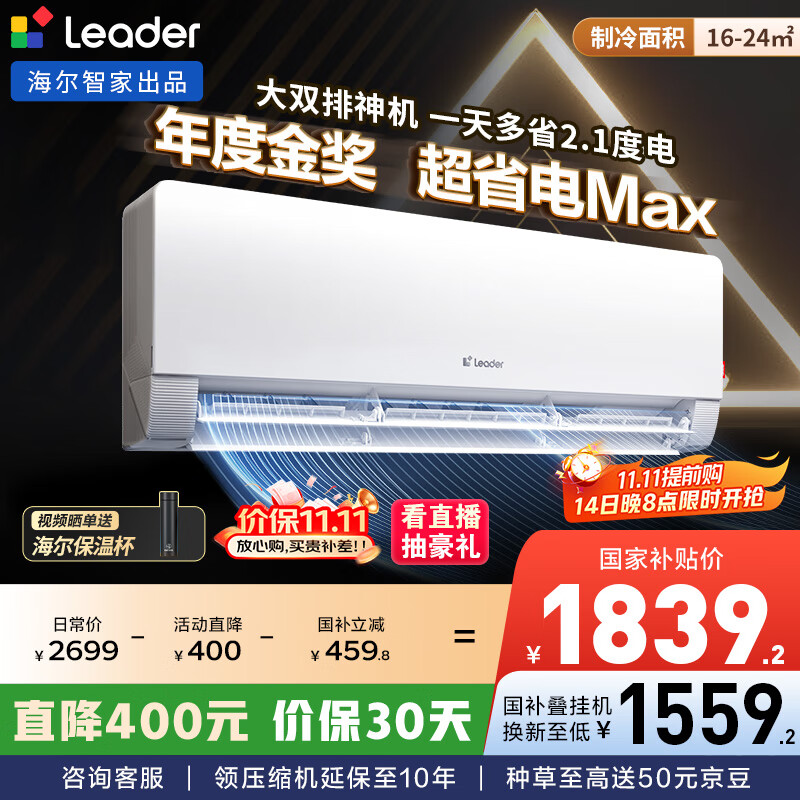 统帅(Leader)海尔智家出品 1.5匹超一级能效 超省电Max大双排铜管 变频空调挂机KFR-35GW/09ETA81TU1国家补贴