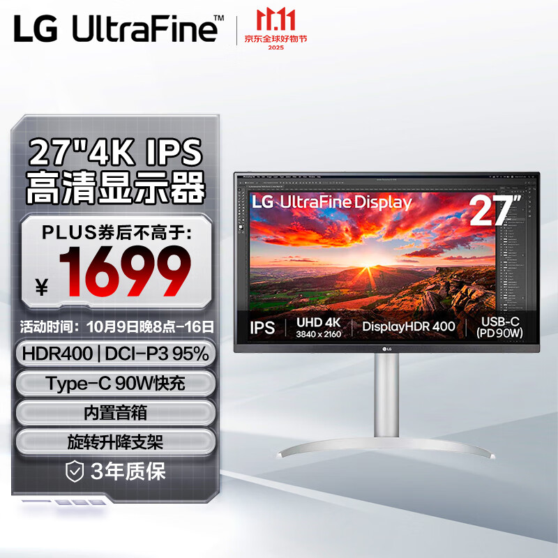 LG 27英寸4K显示器 IPS Type-C90W快充 HDR400 内置音箱 电脑显示屏 适用PS5 27UP850K
