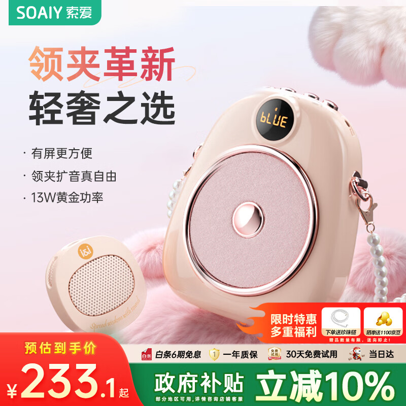 索爱(soaiy)655无线磁吸领夹小蜜蜂扩音器教师专用蓝牙音箱音响防啸叫TF卡喇叭磁吸麦克风导游户外便携式 粉