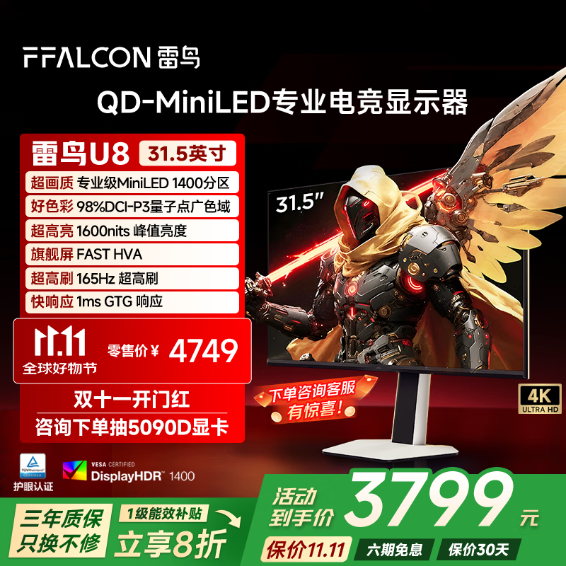 FFALCON雷鸟32U8 31.5英寸4K165Hz 1400分区QD-MiniLED高刷电竞游戏显示器 Type-C90W 旋转升降办公电脑显示屏