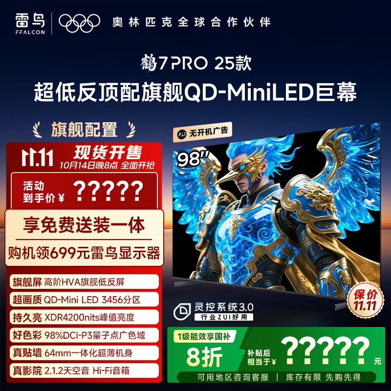 FFALCON雷鸟电视 98鹤7 PRO 25款 98英寸QD-MiniLED华星HVA 背光分区 家电国家补贴98/100英寸电视98R795C