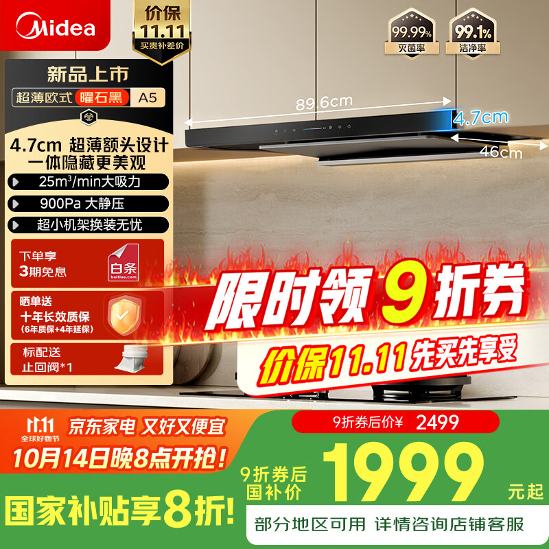 美的(Midea)抽吸排油烟机家用 25风量 欧式顶吸超薄系列 自清洁烟灶联动油烟机CXW-140-A5 曜石黑