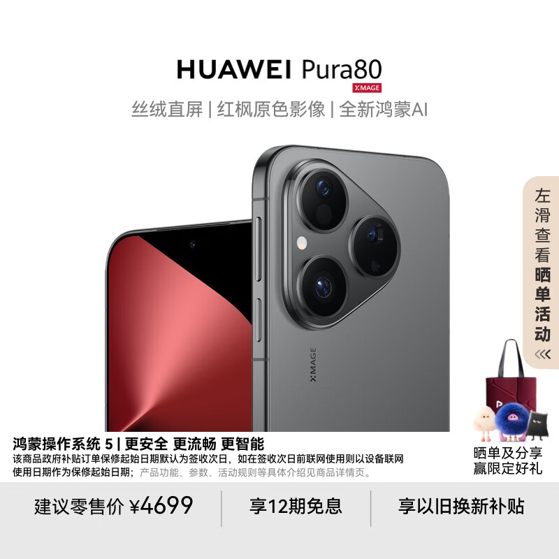 HUAWEI Pura 80 12GB+256GB 丝绒黑 丝绒直屏 红枫原色影像 全新鸿蒙AI 华为鸿蒙智能手机