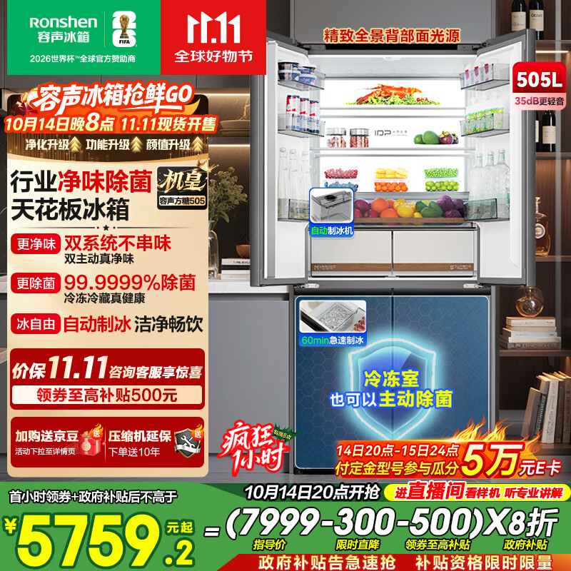 容声方糖505机皇双净双系统十字四开门超薄嵌入式电冰箱家用自动制冰一级能效BCD-505P60CZNAD国家补贴