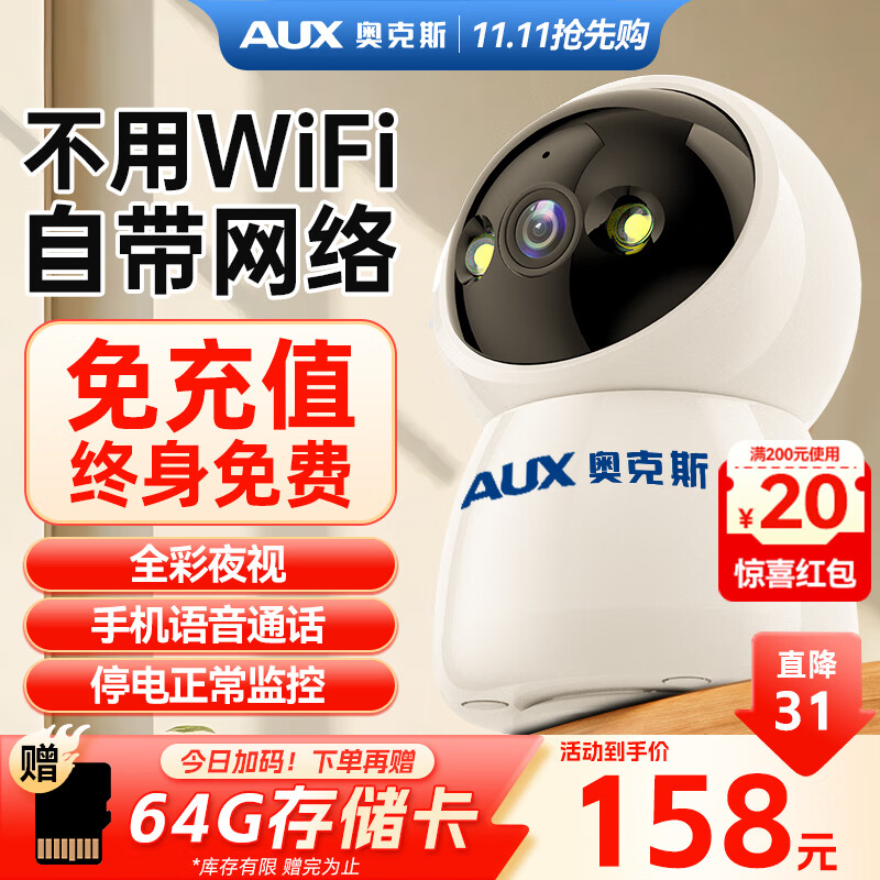 奥克斯500万像素AI无线摄像头4G无需网络终身免费手机远程家用室内免插电360度监控器带夜视