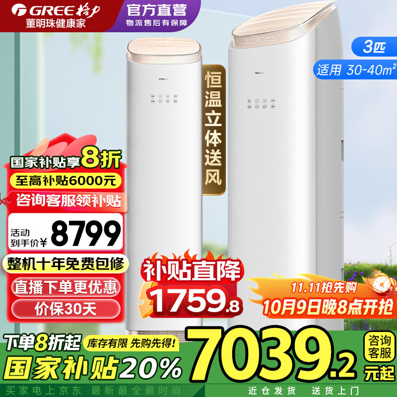 格力(GREE)空调3匹柜机 王者/京致 新一级能效 独特上下送风防直吹 变频冷暖客厅节能立柜式 国家补贴20% 3匹 一级能效 【王者】上下出风 恒温舒适 格力