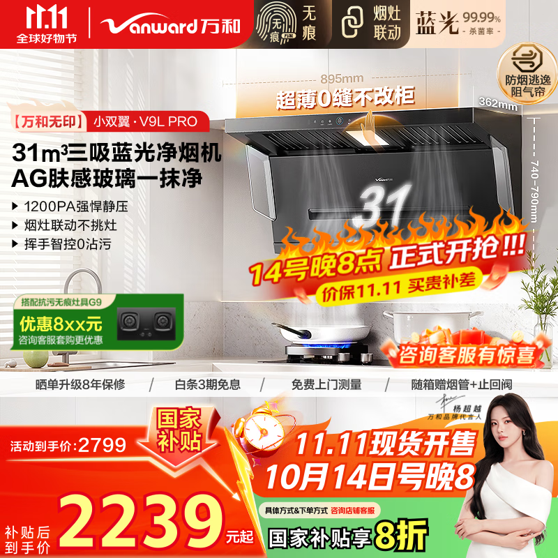 万和(Vanward)【无痕V9L Pro·AG纳米抗污蓝光净烟】顶侧双吸抽排油烟机31风量变频大吸力以旧换新国家补贴20%