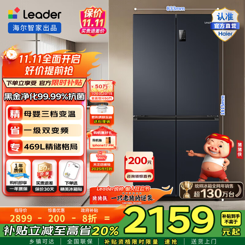统帅(Leader)海尔冰箱出品469升四开门对开家用冰箱风冷无霜一级能效变频母婴三档变温大容量超薄冰箱 BCD-469WGLTDEDBX