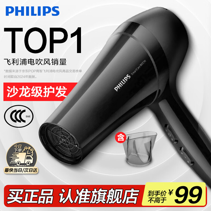 飞利浦(PHILIPS)电吹风机家用大功率 恒温速干 发廊沙龙专业级吹风筒 发廊经典款+1800W+6档丨BHC020