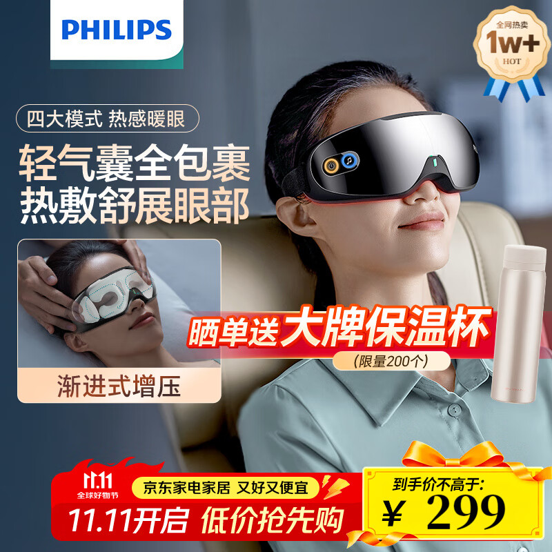 飞利浦(PHILIPS)眼部按摩仪 气囊包裹热敷按摩眼罩 眼部疲劳按摩器 护眼仪成人可视化眼睛热敷仪 伴手礼实用礼物 PPM3203EDG/93深灰色