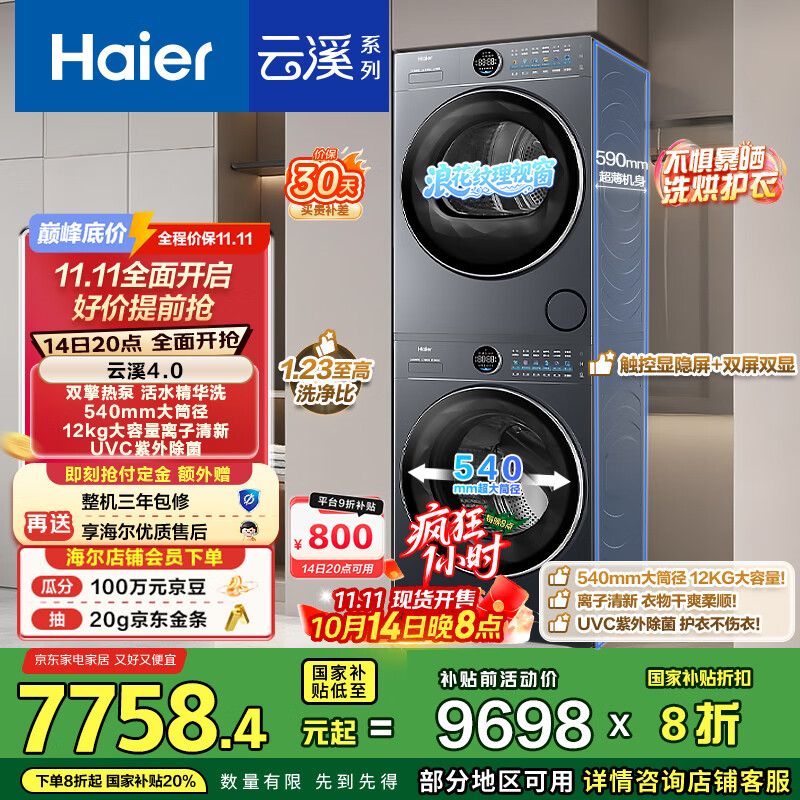 海尔(Haier)云溪4.0 极薄 65D洗烘套装12KG滚筒懒人洗衣机+热泵烘干机家用 540大筒径 65D+65D 国补