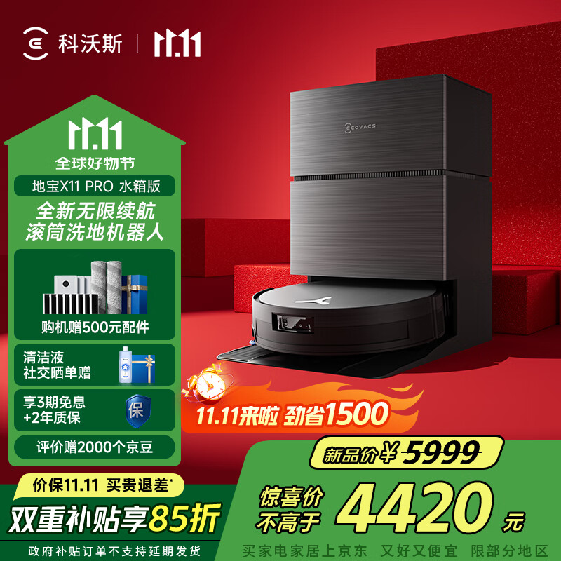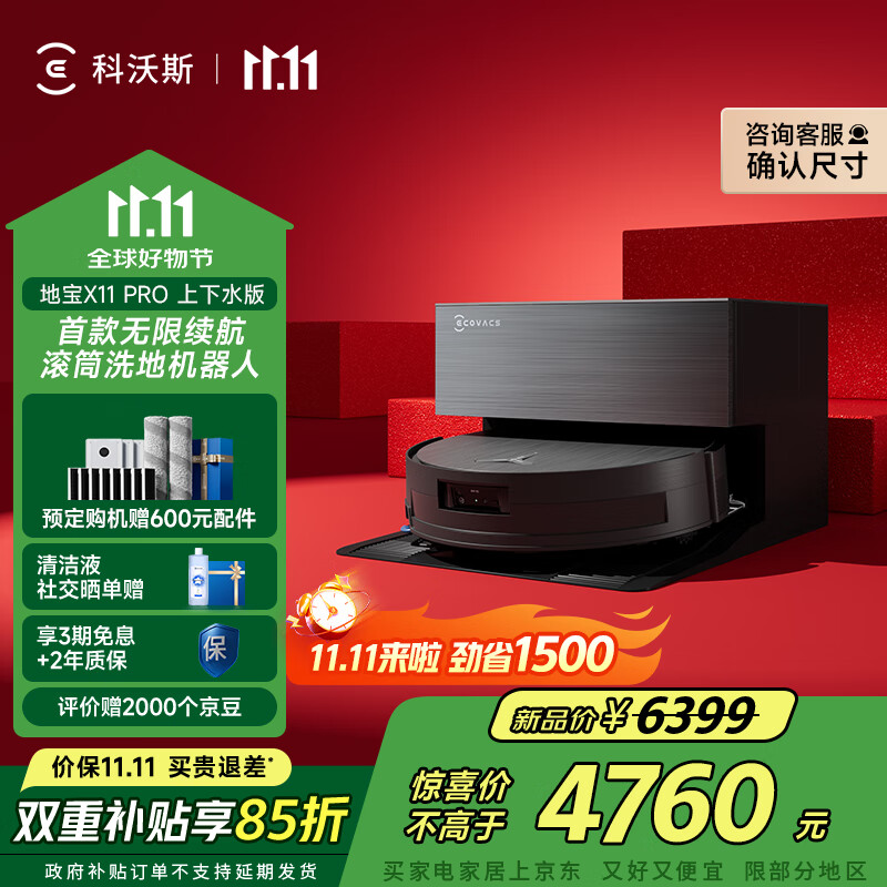 科沃斯X11 PRO扫地机器人扫拖洗烘一体自动清洗滚筒洗地机器人智能家用黑银水箱版【国家补贴】
