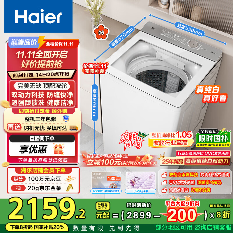 海尔(Haier)全自动波轮洗衣机纯白奶油风10KG小红花双动力XQS100-BE73M京东自营家电国家补贴一级能效紫外杀菌