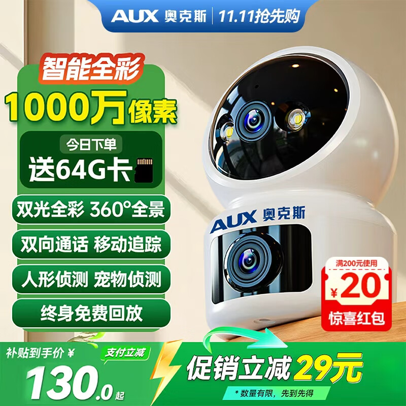 奥克斯1000万像素摄像头监控无线wifi网络高清夜视监控器360度无死角带夜视全景云台家用AI监控手机远程