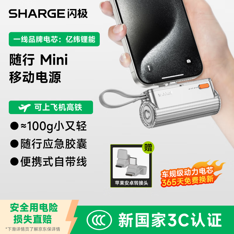 闪极(Sharge)【新3C认证】随行mini胶囊充电宝迷你便携可上飞机自带线快充口红移动电源适用iPhone17华为小米16