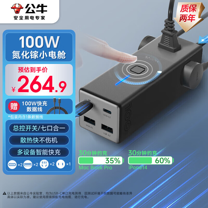 公牛(BULL)氮化镓100W快充笔记本插座/插线板/插排/接线板 3C认证 适用iphone17 总控开关2C2A+3插孔 灰色