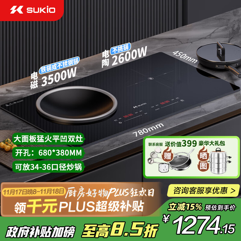 硕高(SUKIO)嵌入式电磁炉双灶大功率家用爆炒电磁炉凹面台嵌两用电磁炉电陶炉双炉左凹右平一电一陶OG010