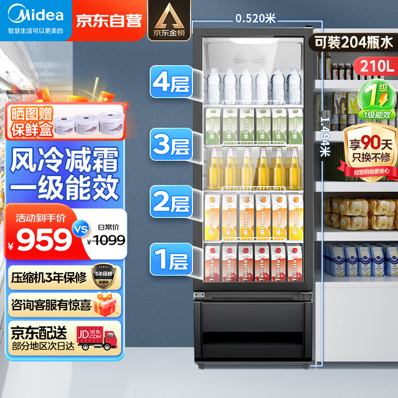 美的(Midea)展示柜冷藏保鲜柜 210升立式单门冰柜保鲜柜冰箱饮料柜便利店透明冰柜黑色一级能效冰箱ML-208DGEB