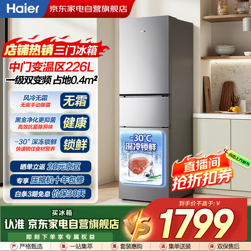 海尔226升三门多温区风冷无霜黑金净化电子控温一级双变频租房节能家用小冰箱BCD-226WGHC3E9XM