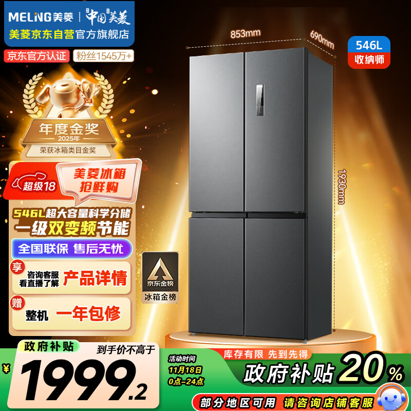 美菱(MeiLing)收纳师546升双变频一级能效十字对开四开门冰箱家用大容量风冷净味国家补贴BCD-546WP9CX典雅灰