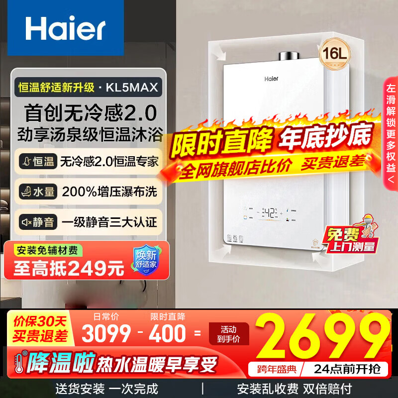 海尔(Haier)【小海鲸KL5max】燃气热水器16升天然气家用TSI增压一级静音下置风机无冷感2.0 16L 【小海鲸KL5MAX】年度爆量新品