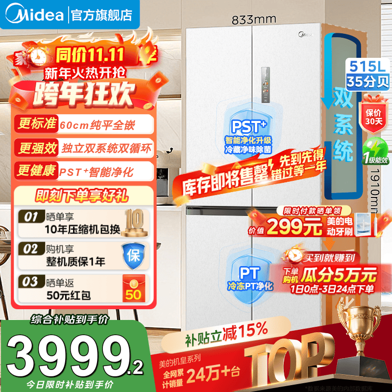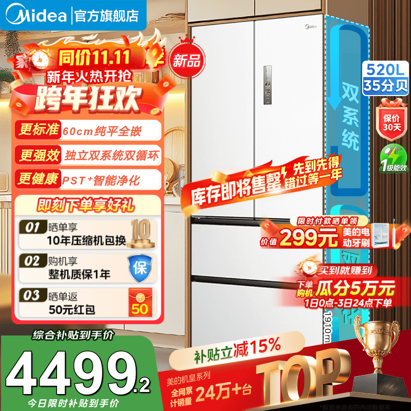 美的M60系列520小机皇法式多门四开门冰箱嵌入净味双系统循环大容量BCD-520WUFPZM(E)补贴立减 520双系统白色