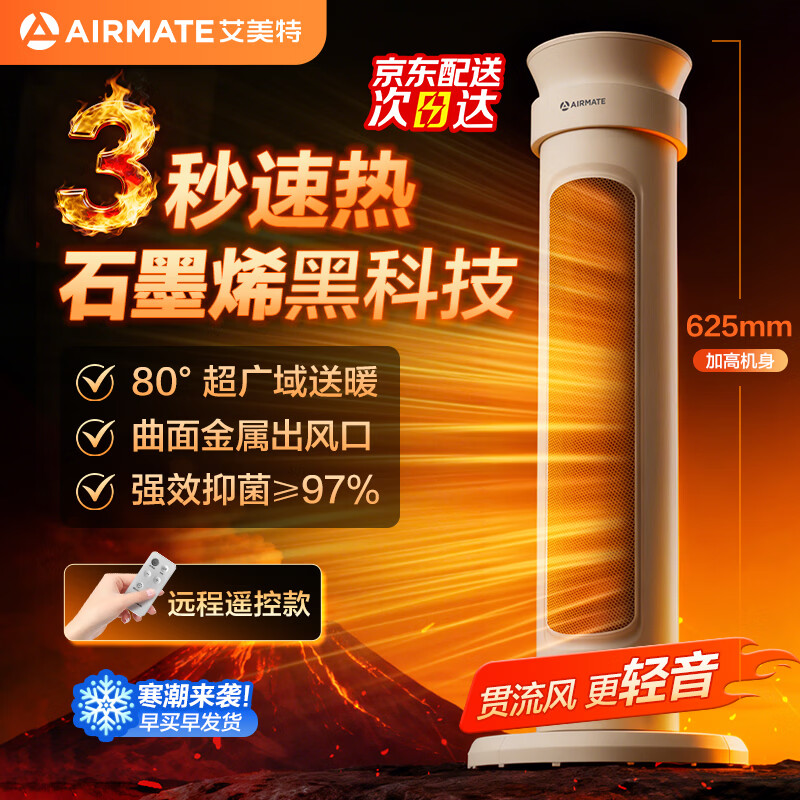 艾美特(AIRMATE)石墨烯暖风机家用节能取暖器语音智控大功率摇头塔式电暖风速热风机宿舍卧室取暖神器办公室电暖气 【远程遥控款】石墨烯3S速热
