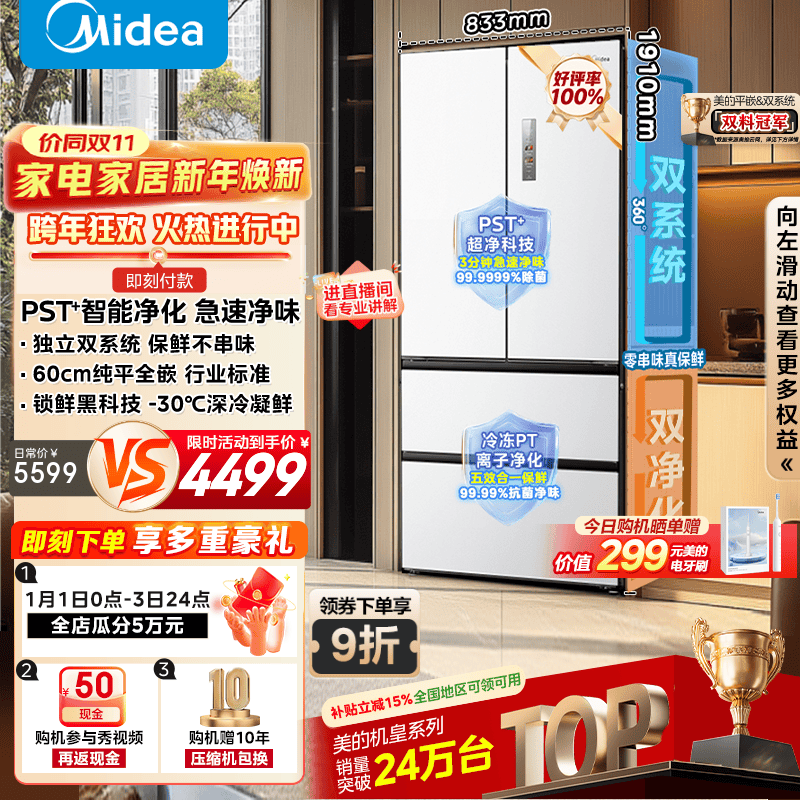 美的M60系列541十字四开门电冰箱双开门双系统双循环家用全空间净化无霜超薄零嵌入一级能效 国家补贴 曦云白