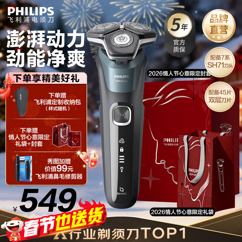 飞利浦剃须刀电动官方旗舰新款黑蜂巢5系旗舰款剃胡刀刮胡刀S5831同款三刀头正品智能情人节礼物 旗舰款S5832【商务蓝】