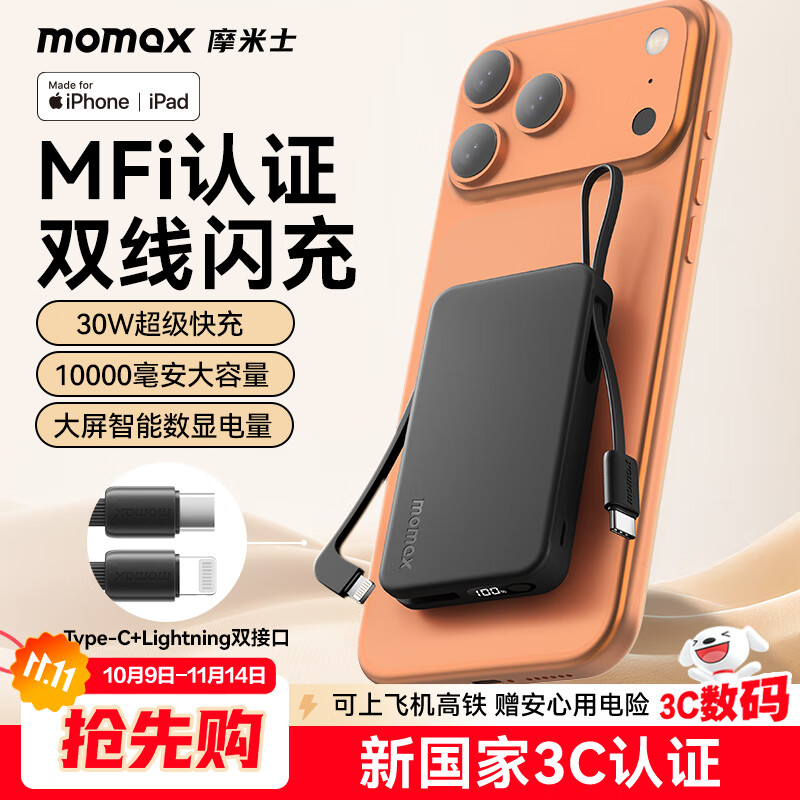 摩米士(MOMAX)【3C认证】MFI认证30W充电宝自带双线10000毫安小巧快充可上飞机移动电源适用苹果17华为小米手机
