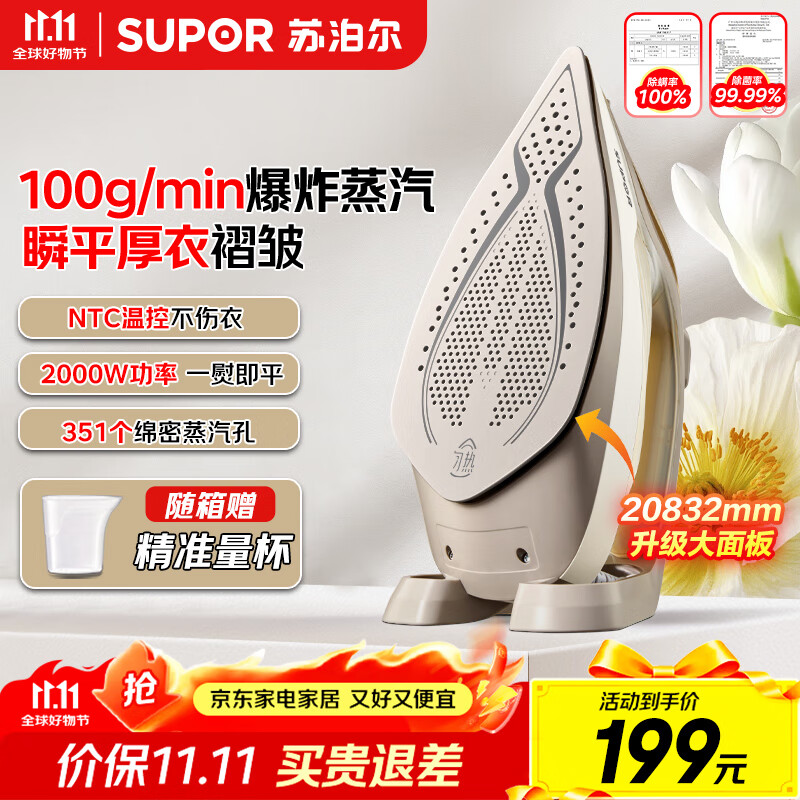 苏泊尔(SUPOR)电熨斗家用手持挂烫机大蒸汽干湿两用2000W大功率服装店专用烫衣机小型熨烫机团购Y60A