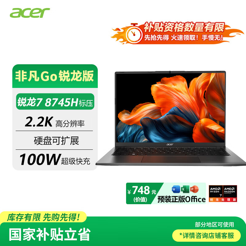 宏碁(acer)非凡Go锐龙版【国家补贴】14英寸2.2K轻薄本 全能办公笔记本电脑(高性能标压R7-8745H 16G 1TB)