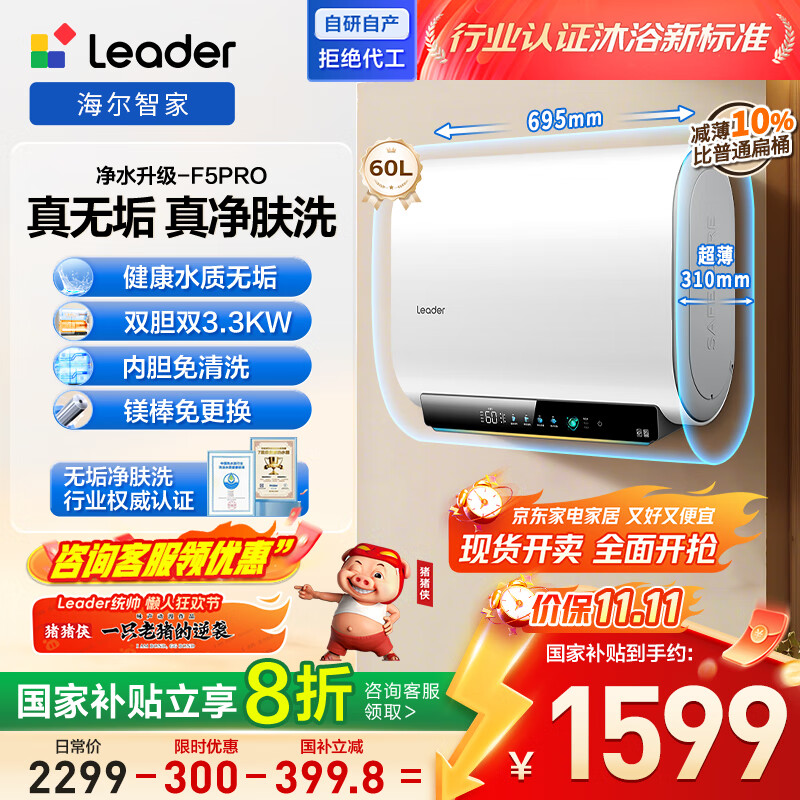 海尔出品统帅懒人系列 60升电热水器净水洗镁棒免更换国家补贴20%变频3300W速热13倍增容一级能效F5PRO