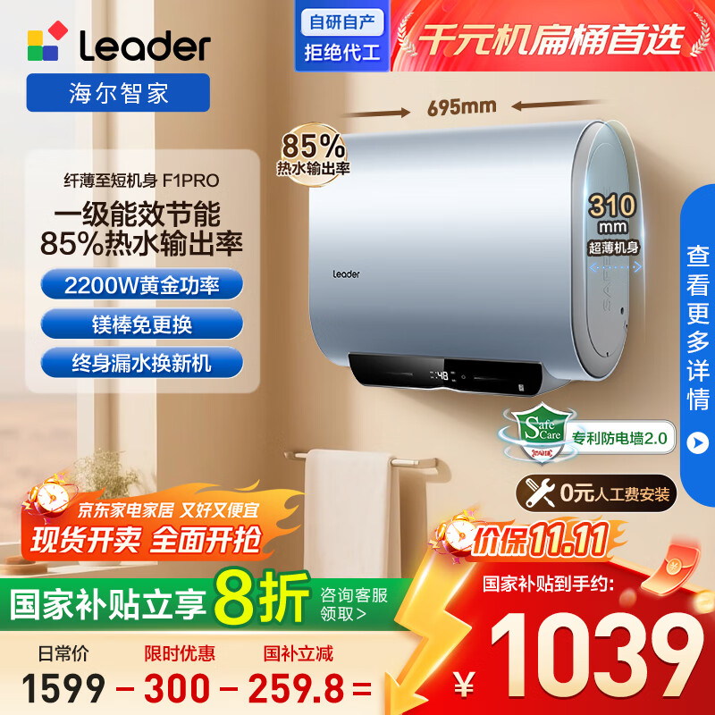 海尔出品统帅 60升懒人扁桶电热水器家用2200W速热国家补贴20%一级能效速热以旧换新F1PROK